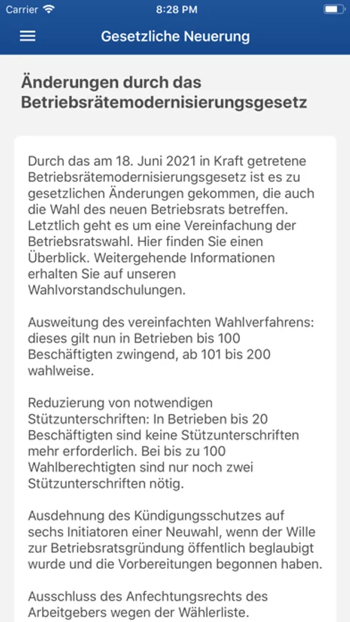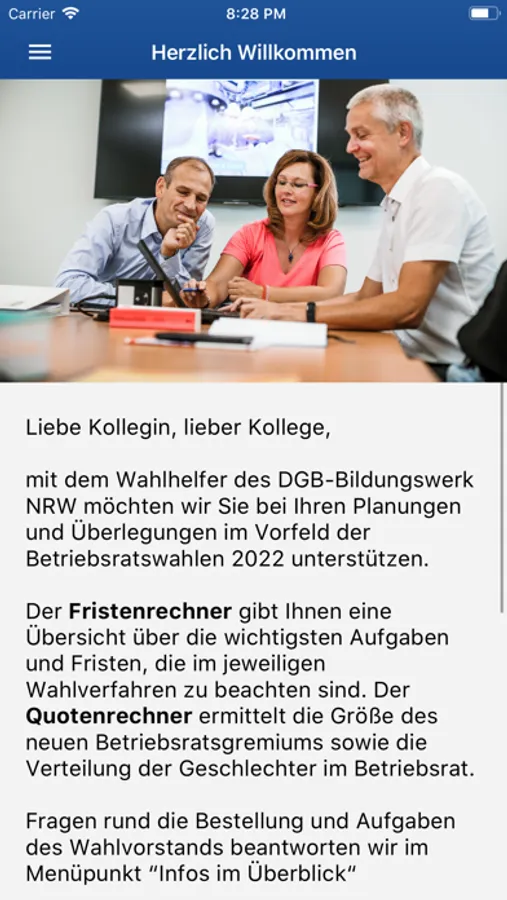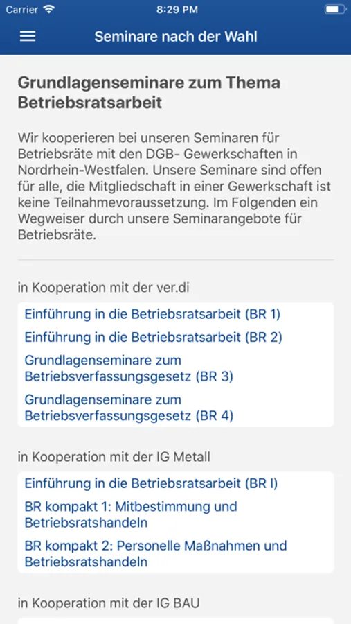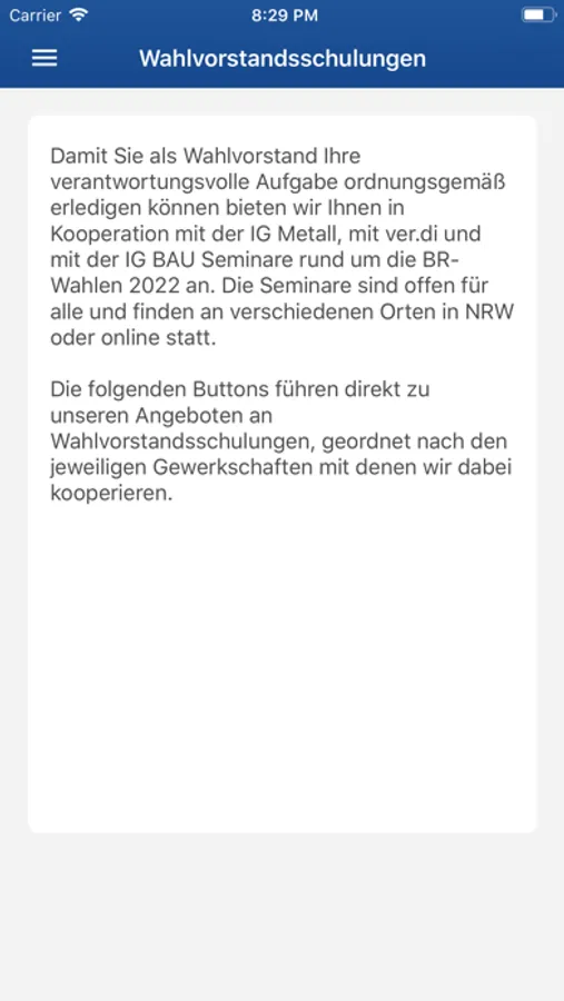 Mit dieser App haben Sie zudem einen jeweils aktuellen Überblick über die Termine und Orte der von uns angebotenen Wahlvorstandsseminare inklusive Anmeldestand sowie einen Überblick über die Termine und Orte der Grundlagenschulungen für neu gewählte Betriebsrät*innen. Für einen guten Start in die Amtszeit!