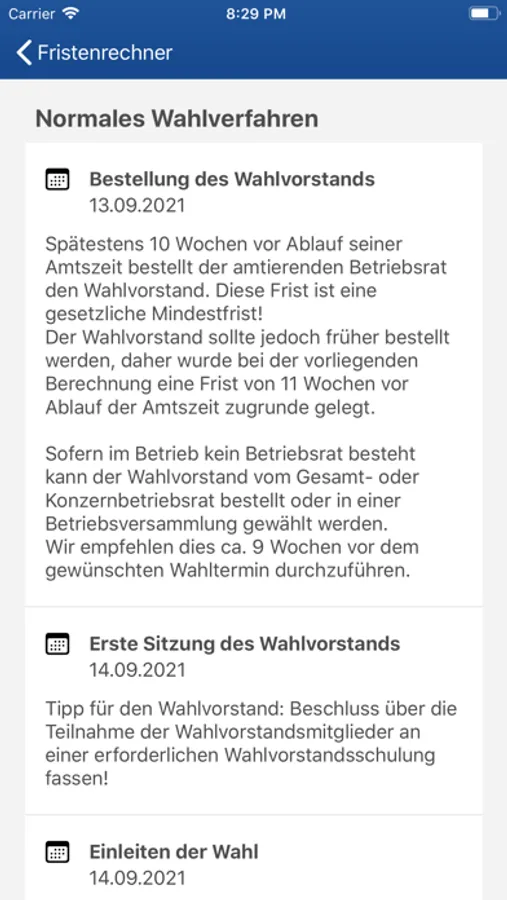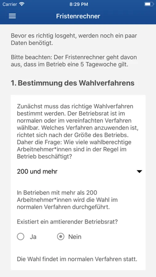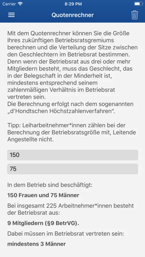 Mit dem Fristenrechner dieser App können Sie das für Sie mögliche Wahlverfahren ermitteln und die wichtigsten Aufgaben und terminlichen Eckpunkte schnell bestimmen. Der Quotenrechner errechnet die Zahl der Sitze im Betriebsrat und klärt, abhängig von der Zahl der weiblichen und der männlichen Beschäftigten, wie viele Sitze eventuell an das Minderheitengeschlecht gehen müssen.