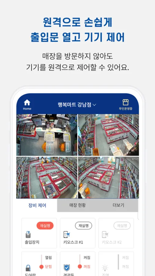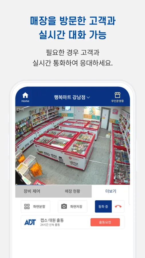 안녕을 지키는 기술 SK쉴더스가 제공하는 '캡스 무인안심존'은 영상 모니터링, 기기제어, 매출조회, 고객응대 기능을 제공하여, 24시간 언제 어디서나 손쉽게 매장을 운영 관리할 수 있습니다.