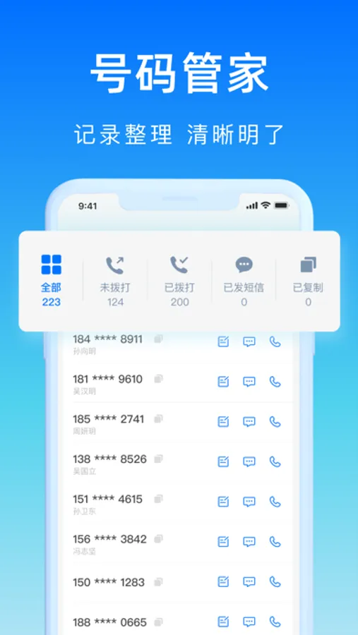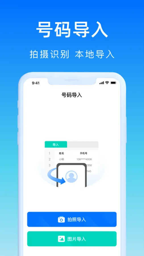 号码识别:提供号码快速识别功能,当你看到a4纸上印满了密密麻麻的电话号码,是否在发愁,手动输入的痛苦是不是深深刻在了DNA里面?现在可以和手动输入说拜拜啦,快速拍照或本地导入,即可一键识别!