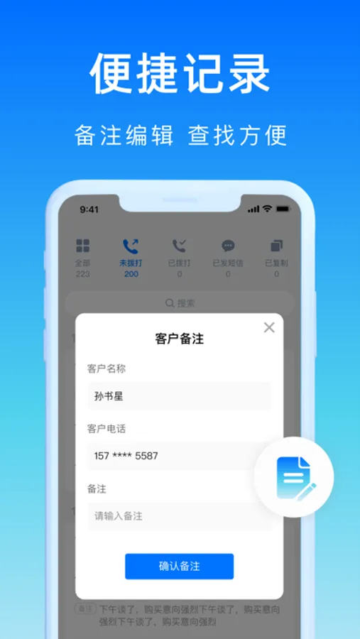 客户备注:不管你是优秀的电销人员还是微商大佬,遇到优质客户当然要特殊记录下来,号码精灵为您提供客户备注,下次联系,客户信息一目了然,便捷又方便!