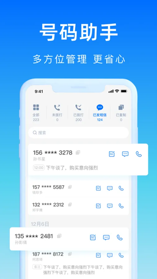 号码精灵为电销人员提供便捷的号码通讯录管理服务,拥有号码识别、备注、便捷拨号等多功能便捷服务。功能详情如下: