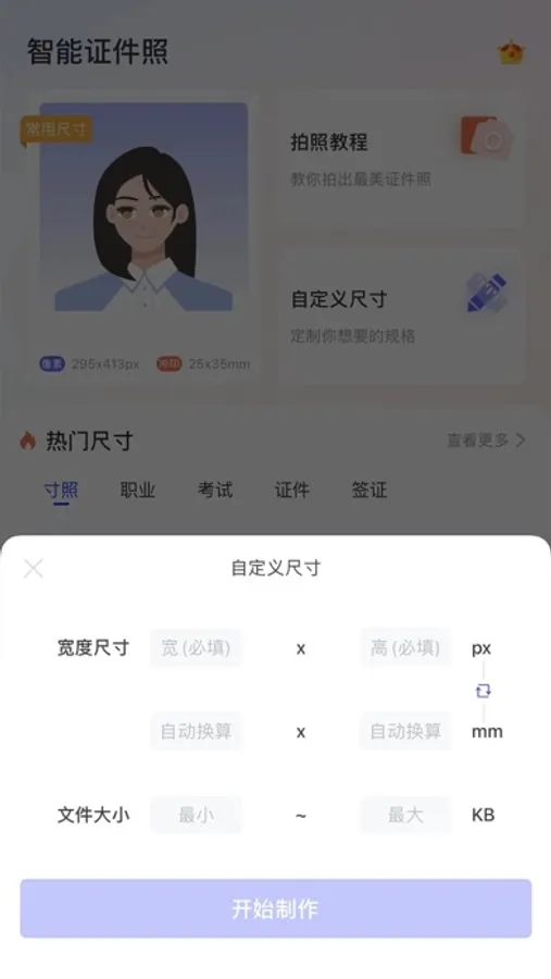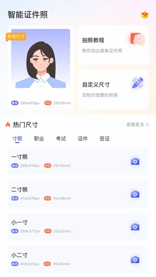1.【拥有500多种证件照规格】 一寸、二寸等常用寸照;专升本、成人自考等学历考试;英语四六级、普通话水平测试等语言考试;计算机等级考试;教师资格证、驾驶证、导游证等职业资格;泰国签证、日本签证等多个国家旅游签证;公务员、事业单位考试;社保证、身份证等身份证件,满足证件照制作的所有场景。