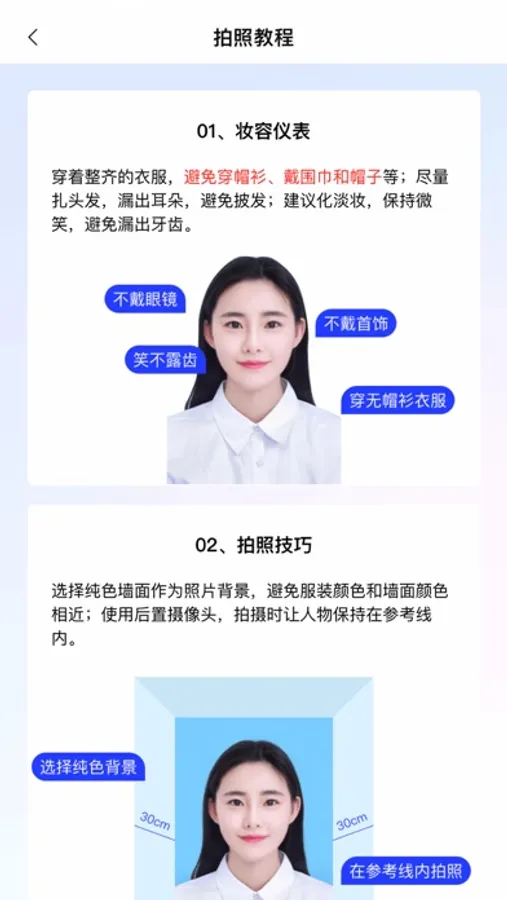 2.【裁剪简单,一键换底,自然美颜】 根据您需要的规格进行裁剪,算法确保人像的正确位置及比例,底色随意选,让您的证件照与众不同!根据专业的人像识别算法,在保证证件照不失真的情况下,可对照片人像进行磨皮、美白、瘦脸等功能,快速制作自然好看的最美证件照! 智能证件照虽然一直被模仿,但难以被超越!我们的目标是,让您用手机也可以轻松拍出专业合格好看的证件照!