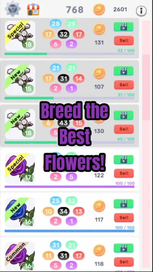 Each attribute is different and will be either dominate, recessive, and even flower color dominate. Attributes genotype, hidden modifiers your trying to increase or decrease to get to 768, are shown to you as the phenotype, an observable characteristic, as numbers for you to breed with new flower generations.