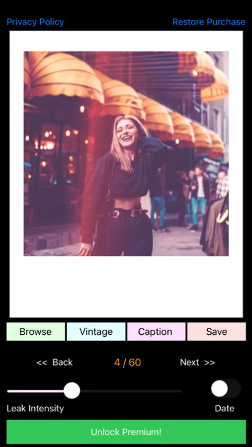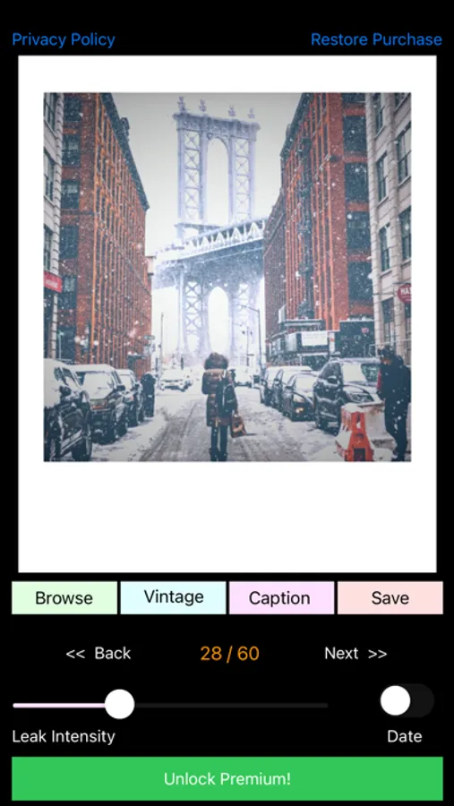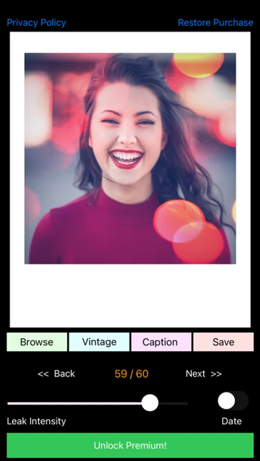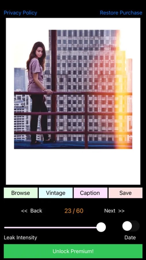 The app automatically edits the user's image, adds effects, and applies astonishing artfully-designed leak lights on the image, that is, the user doesn't need to adjust the image colors but instead the App proposes various design options to the user. The internal engine of the App blends the light leaks within the user's image via various techniques, such as Linear Burn, Soft Light, Darken, and many more, and at the end the user can add a favorite caption and timestamp, and conveniently save the final image in the Photo Album, and share it via Instagram, Facebook or other social media platforms. This App has a free trial version which allows users to explore the App in its FULL capacity and features.