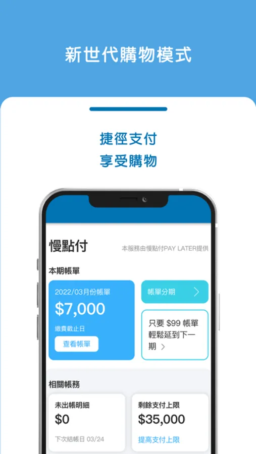 不綁信用卡、不用儲值,立即擁有購物額度,多種還款方案,超商繳費便利,快點買,慢點付,實現支付新態度。