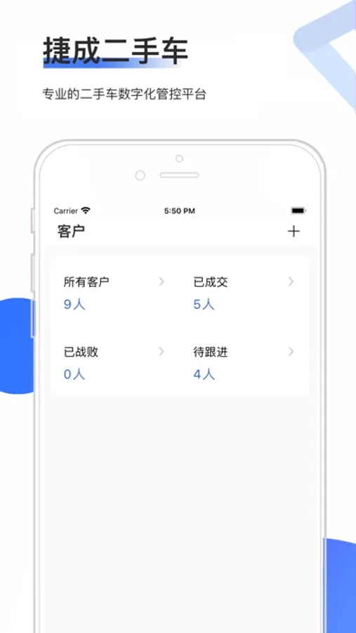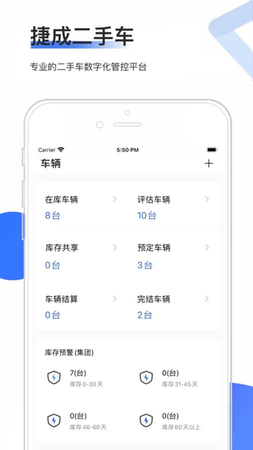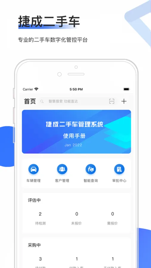 捷成二手车数字化管控平台是一款简单、高效、快捷的APP,用全新的方式,将二手车数字化管理管控理念融入到实际业务流程当中。主要面向二手车行业的相关人员,包括评估师 二手车专员、二手车主管、二手车经理等。