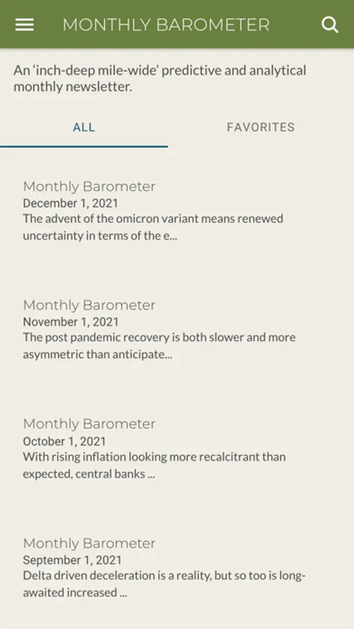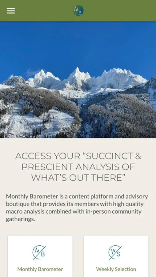 The Monthly Barometer App enables time-starved decision-makers to access incisive and prescient analysis of what’s out there. All our content is based on a rigorous methodology and synthesized feedback from an exceptional international network. The Monthly Barometer is relevant to all and read by the influential. Our one-page “inch-deep, milewide” predictive and analytical monthly newsletter distils how the major macro issues (economics, geopolitics, society, environment and technology) intersect and impact today’s world. It reduces complexity and achieves clarity by conveying a simple (yet not simplistic) message. To paraphrase John Maeda, we take away the obvious and add the meaningful. Every week, we also provide 5 insightful op-eds or articles to help you make sense of today’s world. These are often, though not exclusively, sourced from thinkers and experts from the Monthly Barometer’s network. The Monthly Barometer App also notifies you when a new publication is available and when your membership comes to renewal.