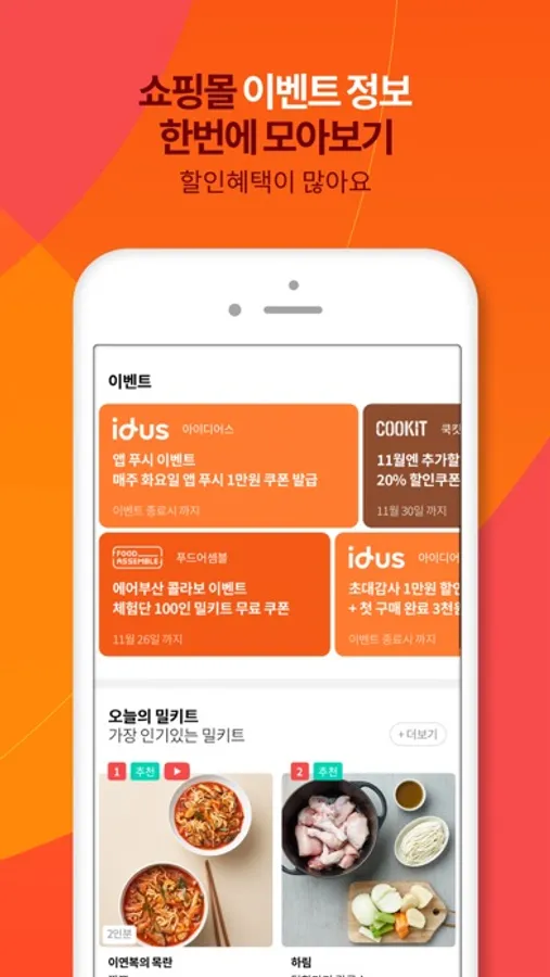 - 인기, 추천 밀키트 및 이벤트 정보를 제공 합니다.
