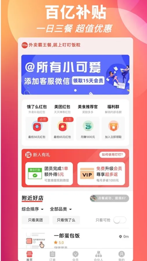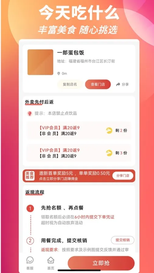 叮叮饭粒霸王餐是一款专为用户吃外卖省钱的生活工具,美团外卖、饿了么外卖红包天天领,每天都可省钱。 外卖优惠券领券神器,专注为用户省钱大额优惠券每天更新,省钱高至90%买前先搜券买到就是省到! 北京,武汉,郑州,南京,杭州,广州,深圳,上海.福州等城市,更多城市敬请期待 来自10000+用户的五星好评; 平时工作忙,点外卖就是一件很烦恼的事情。 每天都不知道吃什么,有叮叮饭粒之后,想吃什么就吃什么,实现吃外卖自由。 不但省钱,而且解決一日三餐的问题!
