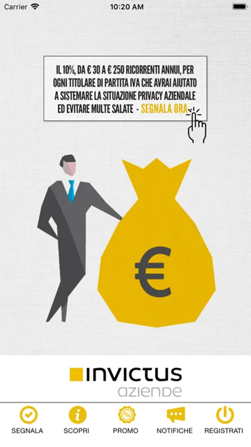 Diventa Segnalatore di INVICTUS AZIENDE ed incassa subito da € 30,00 a € 250,00 (anche sotto forma di buoni amazon) per ogni persona (Professionista o Titolare di azienda) che aiuterai consigliando di rivolgersi a noi per adempiere agli obblighi Privacy previsti per la sua realtà aziendale. Tramite la nostra APP potrai tenere traccia delle segnalazioni, verrai aggiornato sul loro andamento fino a quando riceverai la notifica che puoi ritirare il tuo compenso. L'App è completamente gratuita e potrai condividerla con altre persone se la reputi valida. Siamo veramente entusiasti di vederti nella mia rete di segnalatori per lavorare assieme e guadagnare assieme.