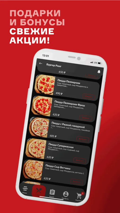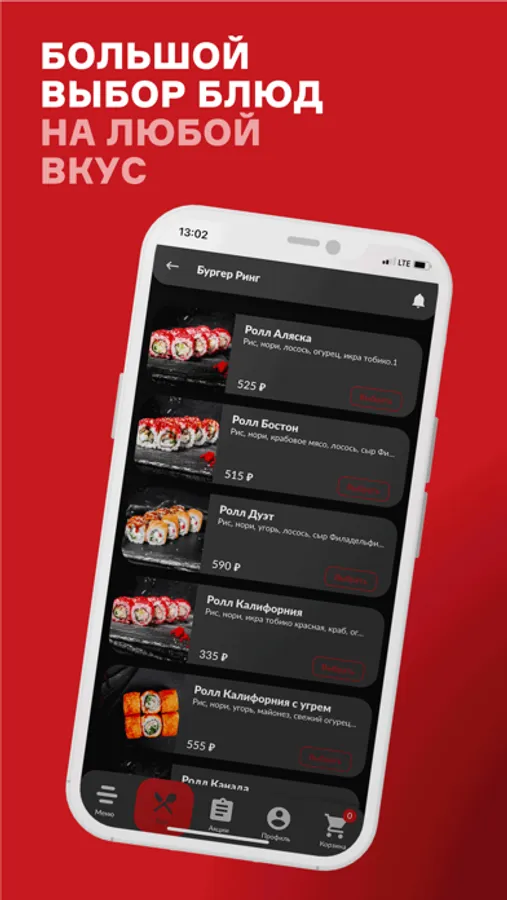 Настоящие бургеры, сочная пицца, свежие роллы и суши, вкусные десерты в удобном формате.