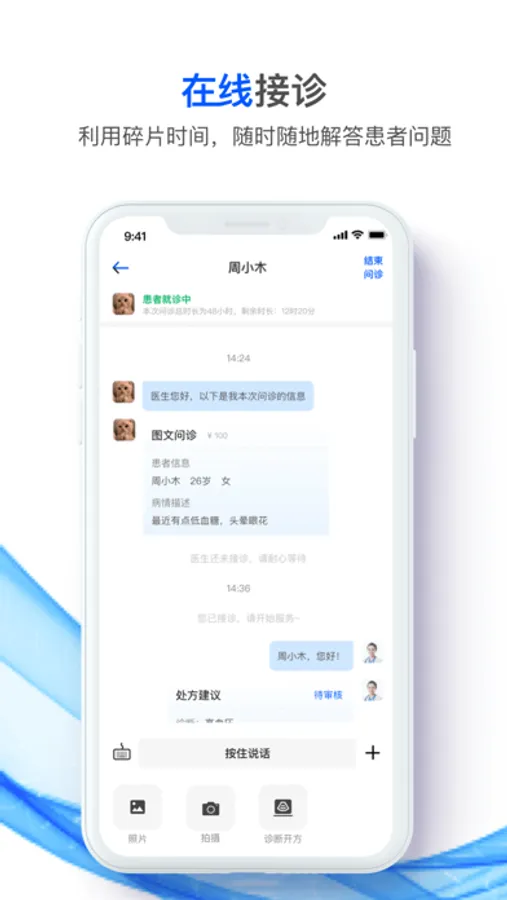 患者线上购买问诊服务,医生以图文、语音形式与患者沟通。