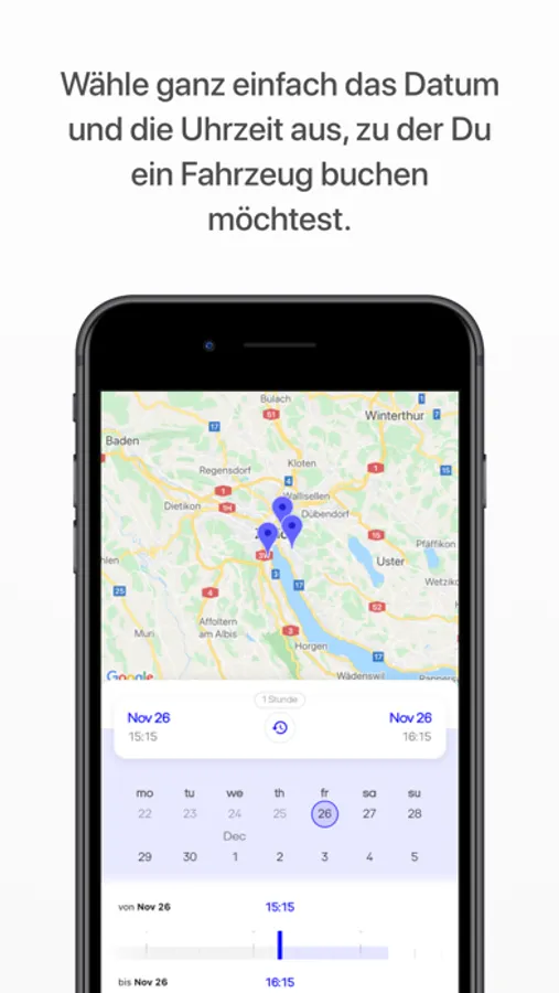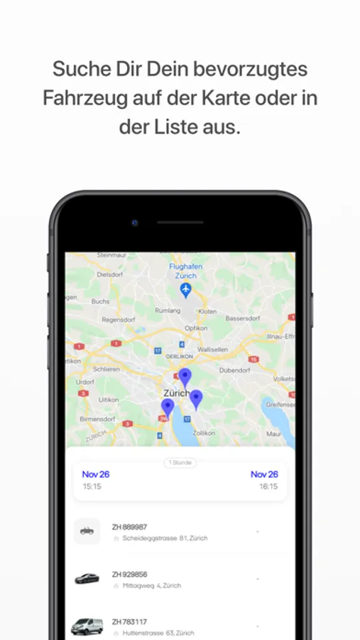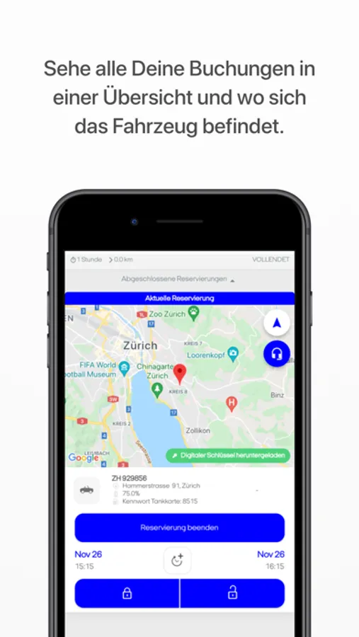 Alle Fahrzeuge mit unserem System sind in der App ersichtlich. Somit können Ihre Mitarbeiter:innen/Mieter:innen jederzeit das nächstverfügbare Fahrzeug reservieren und nutzen. Die Fahrzeugauslastung lässt sich auf diese Weise enorm steigern.