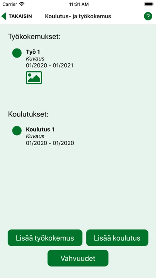 Sovelluksen kohderyhmällä on myös työelämässä erityisvaatimuksia ja kuten muissakin osioissa, toiminnot on suunniteltu tukemaan käyttäjän itsenäisyyttä ja lisäämään ymmärrystä omasta osaamisesta ja vahvuuksista. Siihen voi ladata videoita itsestä suorittamassa erilaisia työtehtäviä, joita sitten vaikkapa seuraavat työnantajat ja esimiehet voivat tarkastella. Esimiehet voivat myös videoissa kertoa käyttäjän pärjäämisestä työpaikalla ja tuoda hänen vahvuuksiaan esiin hyvin konkreettisella tavalla. Työelämäosio sisältää lopulta vielä uudenlaisen, positiivisen CV:n, joka havainnollistaa erilaisin graafisin ratkaisuin käyttäjän työhistoriaa ja ydinosaamista.