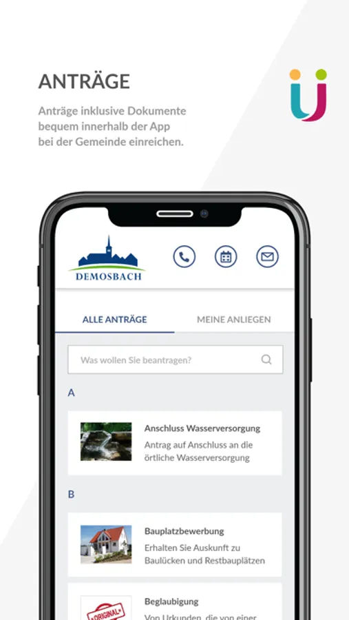 Anträge inklusive Dokumente bequem innerhalb der App bei Ihrer Stadt oder Gemeinde einreichen.