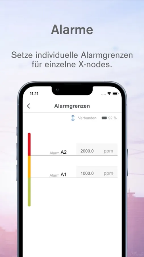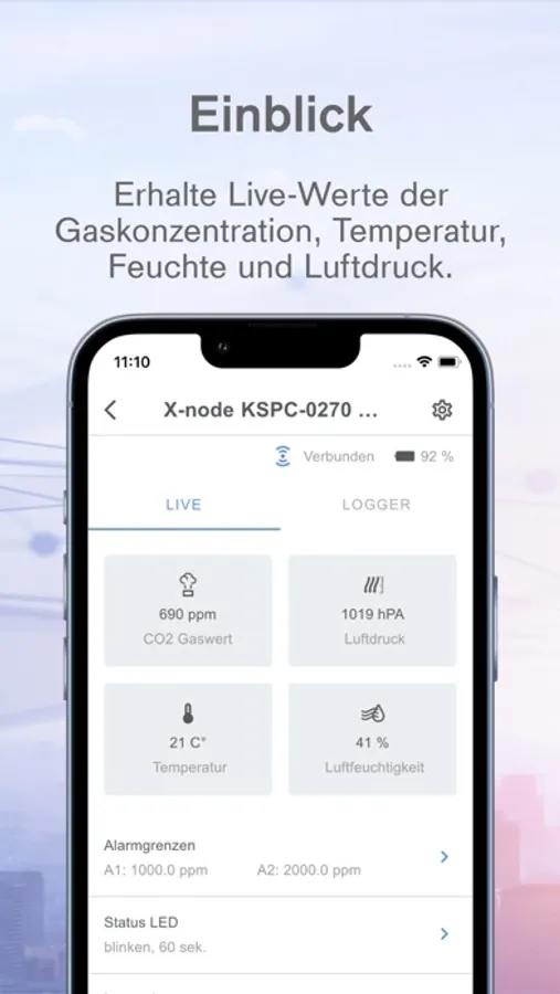 Alarm limits can be set in the app. In addition, the user can set at which gas concentration the status LED lights up green, yellow or red. Furthermore, the blinking pattern as well as the time interval in which limit violations are visualized by the status LED can be set.