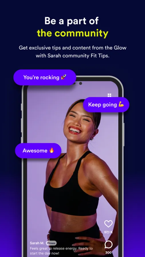 Join the club to stay motivated on-the-“Glow” - Be part of the community even when you aren’t working out by viewing Sarah’s exclusive app content and Fit Tips feed at any time, anywhere.