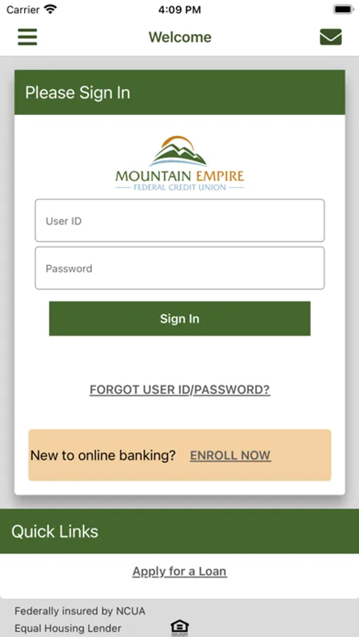 Securely access your MEFCU accounts anytime, anywhere using your mobile devices. Quickly login using facial recognition, fingerprint authentication or a 4-digit passcode. Simply download the app, launch it and login using your online banking username and password. If you have not registered for online banking, select ‘Enroll Now’ to get started. If you are not a member, learn more and apply to join at www.MountainEmpireFCU.org