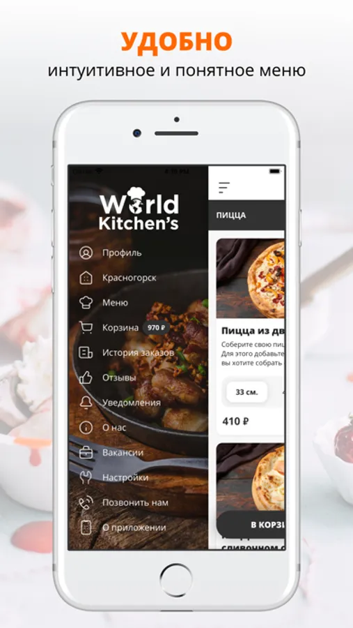 В нашем приложении можно заказать еду и напитки из World Kitchens с доставкой по Красногорску и ближайшей округе!