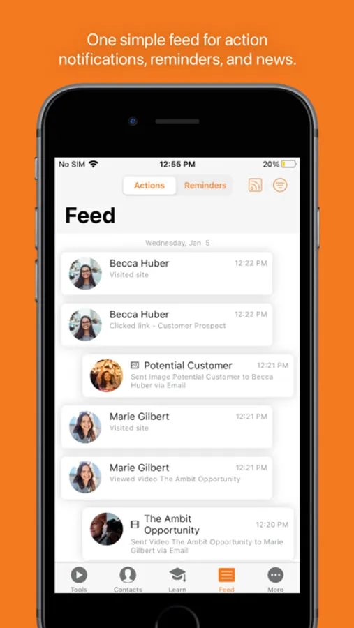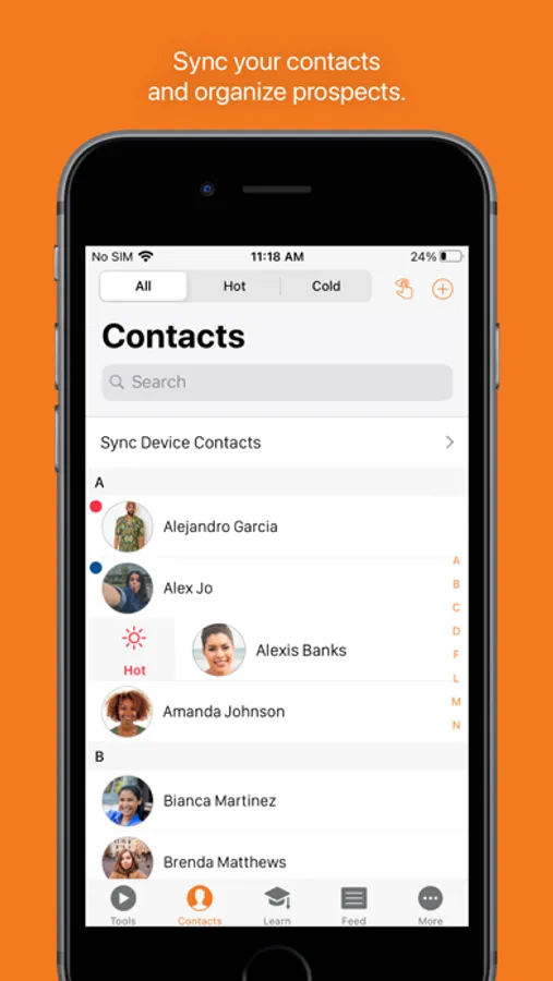Contacts: Choose how to sync and manage your contacts. Swipe to sort them by interest level. You can make connections, add notes, or check out the Contact Feed to see the tools you’ve shared and contact actions.