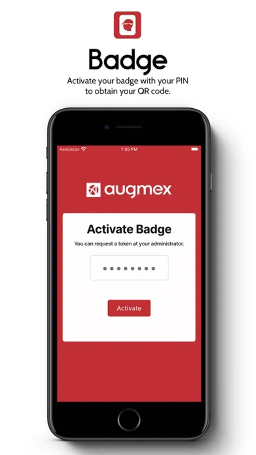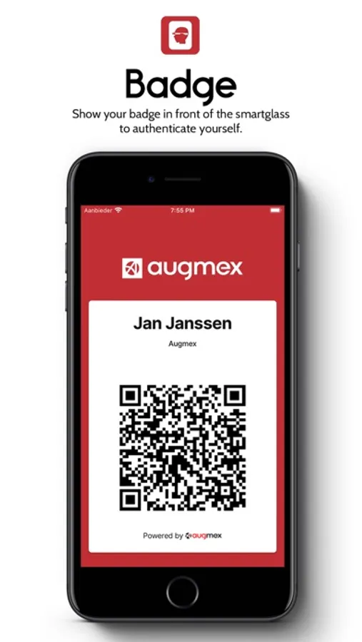 The Augmex Badge application is used for authenticating users on a smartglass. Activate your badge with a personal temporary PIN and obtain a QR code.