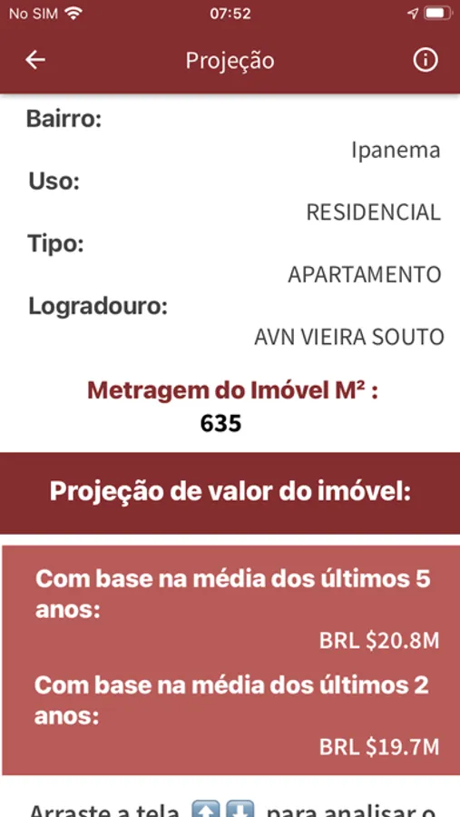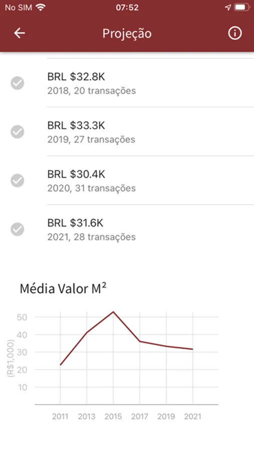 Com apenas um clique, você obterá 2 projeções de valor com a média do m² dos últimos 5 e 2 anos e poderá saber imediatamente se a tendência do mercado é de alta ou baixa.