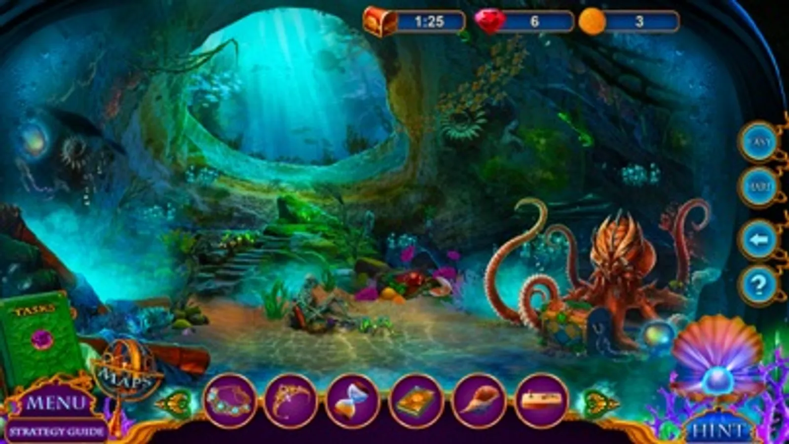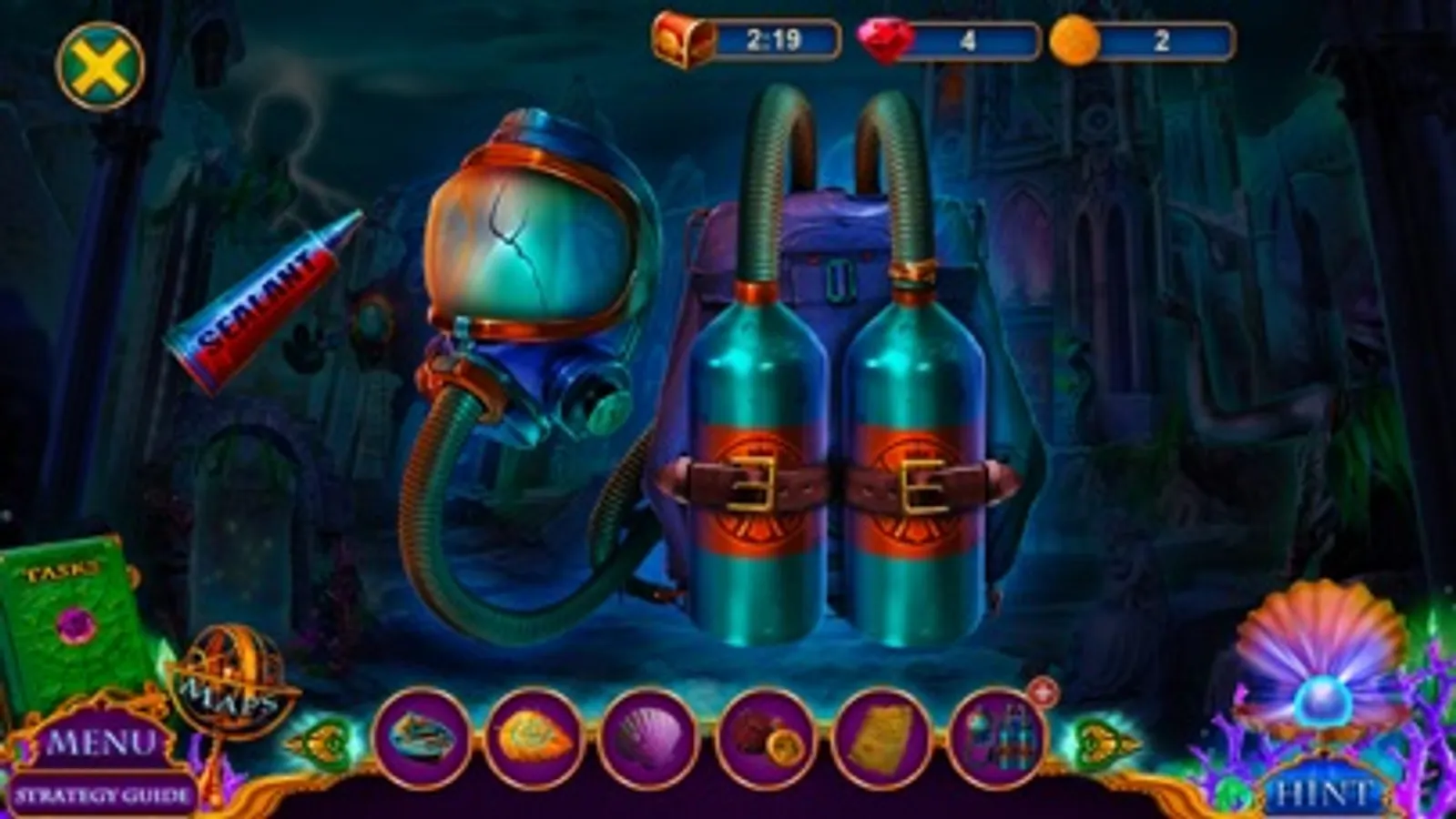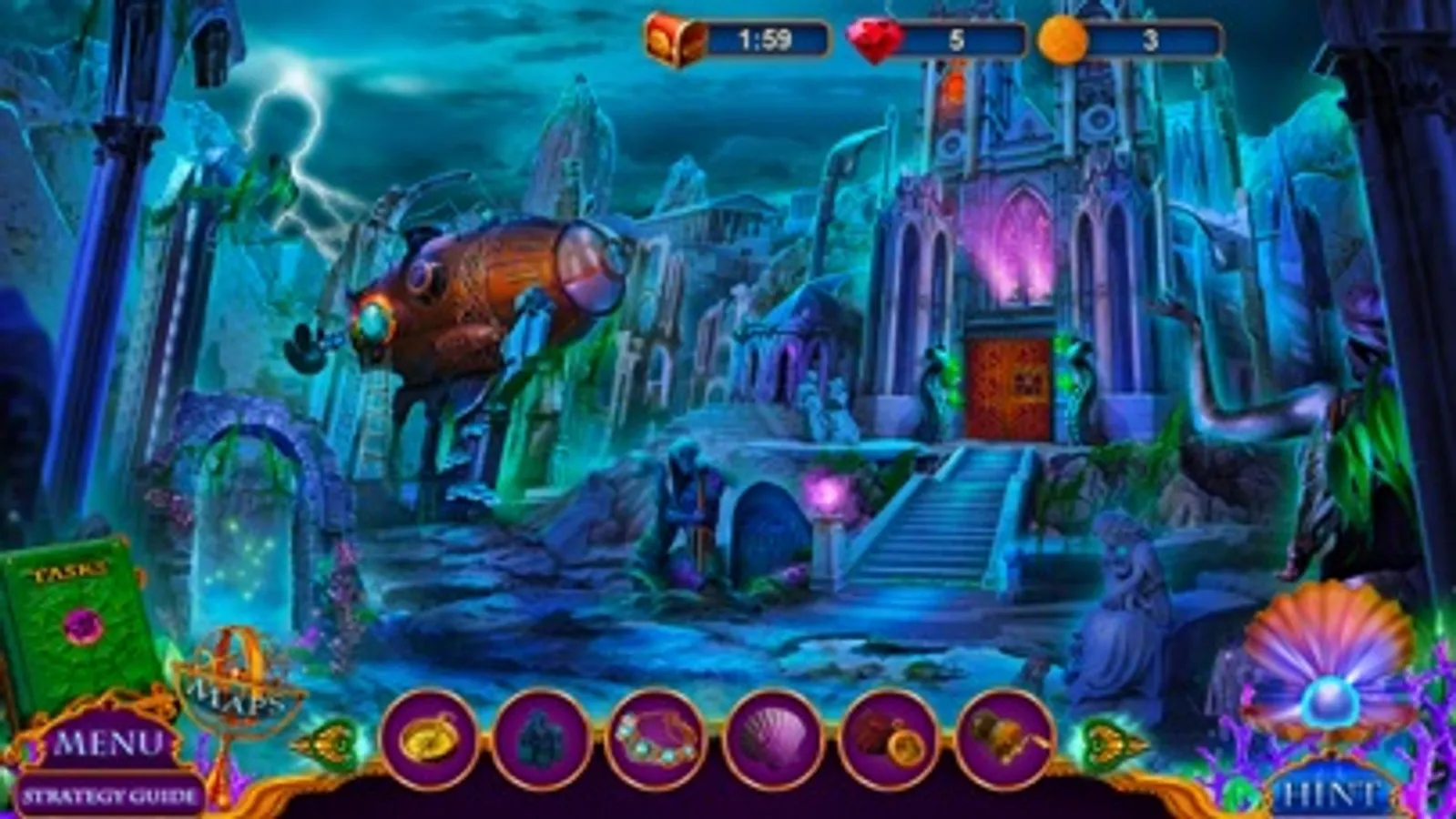 Download one of the most amazing free find object games – Secret City: Sunken Kingdom Collector’s Edition! Play the game for absolutely free, but if you feel stuck or don’t want to solve a mini-game, you may buy hints to help you proceed quicker!