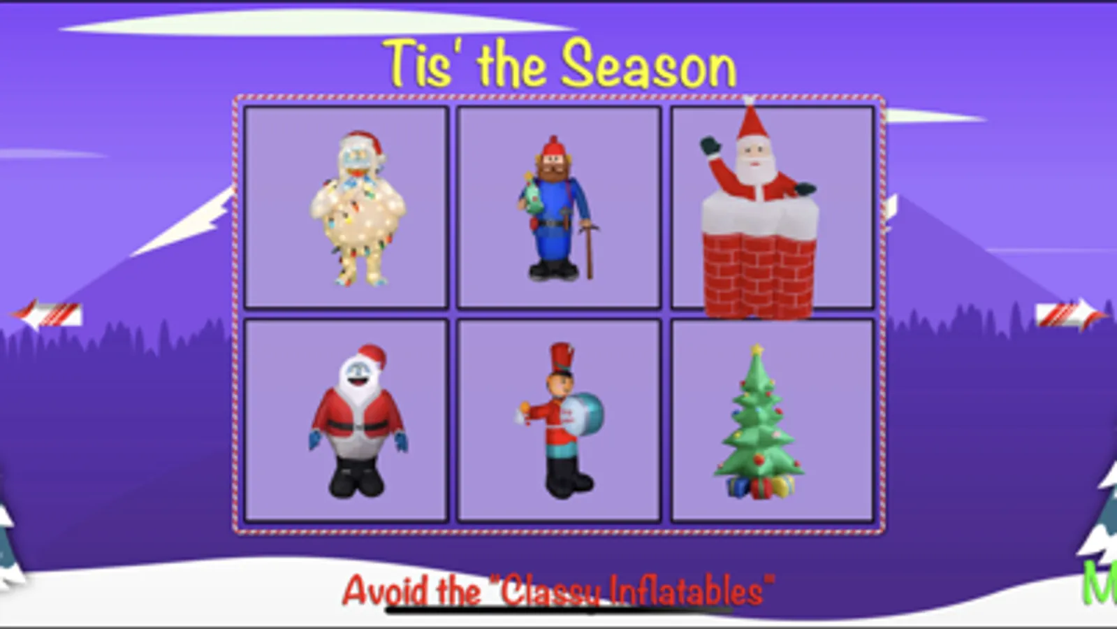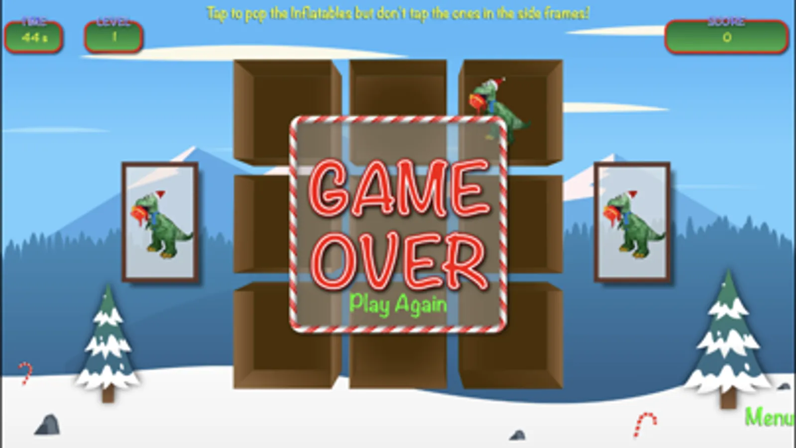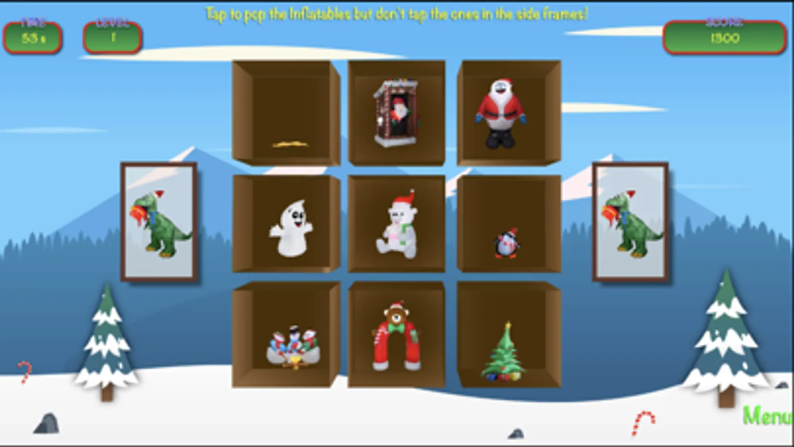 Pop-A-Mode - In this mode, Inflatables appear for a limited time and you have 60 seconds to score as many points as you can. Each inflatable takes one shot to remove, but be careful because any of the classic Christmas inflatables will take away your points. To shoot the inflatable tap on it as it shows up on the screen. It will rise up from the scene stay for a second, and then disappear by receding back into the scene. It can be shot in all 3 actions, but is harder to hit when it is inflating or deflating. Score extra points for any Santa or Snowman inflatable that doesn’t make any sense. Earn extra shots for taking out the leftover Halloween inflatable, and do not hit the Yeti inflatable or it is Game Over!