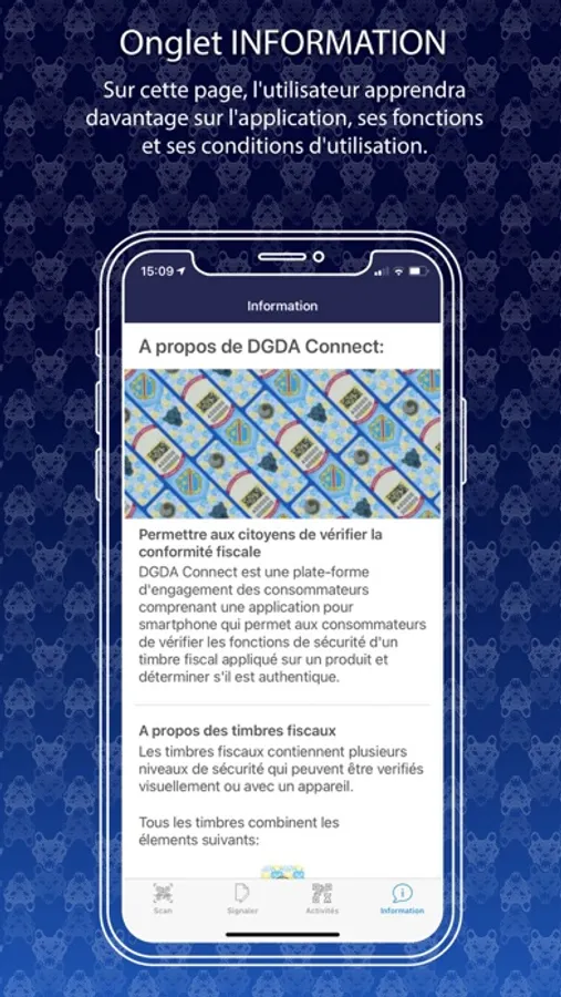 DGDA Connect est une application pour smartphone et tablettes qui permet aux consommateurs de vérifier les vignettes et de récupérer les informations relatives aux produits sur lesquels les vignettes sont apposées. L’application permet aux utilisateurs de participer activement au contrôle de conformité des produits d’accises, soumis aux réglementations en matière de marquage. Les utilisateurs peuvent immédiatement envoyer un rapport, via l’application, auprès de la DGDA, facilitant ainsi les inspections sur le terrain.