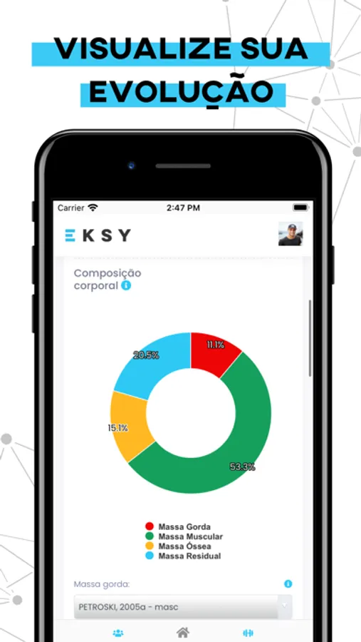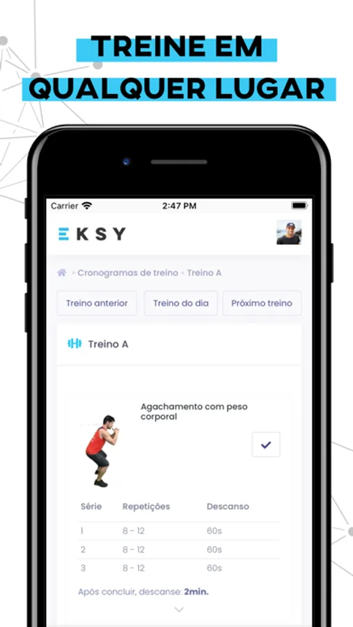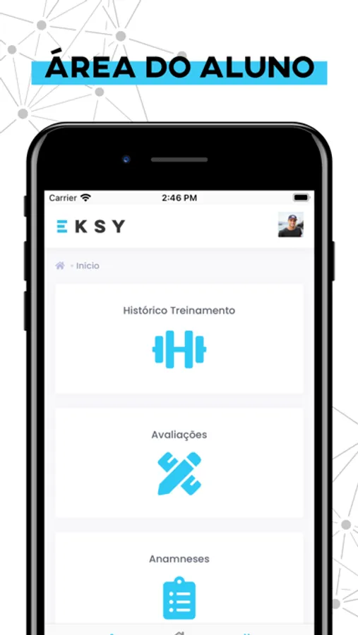 Com o app Eksy: área do aluno, seu aluno pode visualizar o resultado de suas avaliações, responder e visualizar anamneses e o melhor, pode visualizar seus treinos e treinar em qualquer lugar!