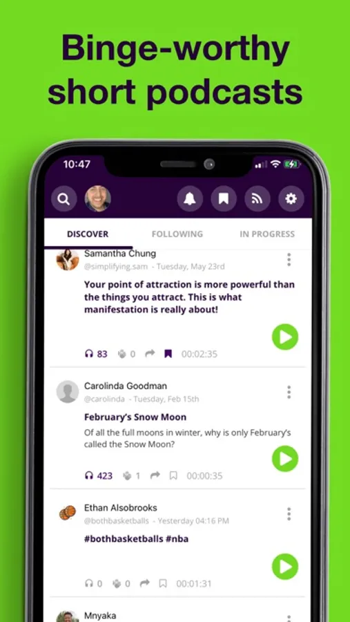 Discover engaging, super binge-worthy, short podcasts on Shortcast Club. Most episodes run 1 to 3 minutes. Hundreds of your favorite creators and influencers post audio clips here daily. Download now so you don't miss any!