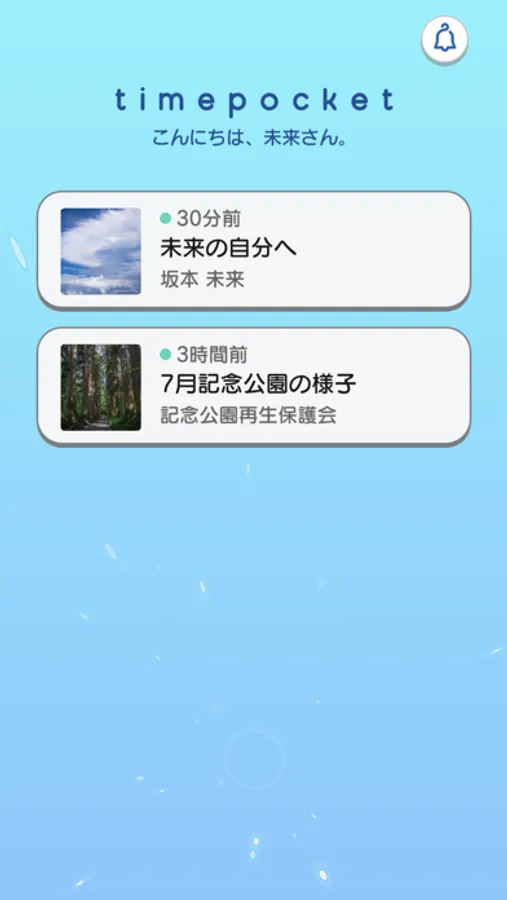 timepocketは、個人や企業が未来の特定な日時に大切な人へ伝えたかった事・伝えられなかった想いをメッセージ(データ)として第三者へ届け、閲覧するアプリです。