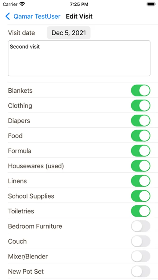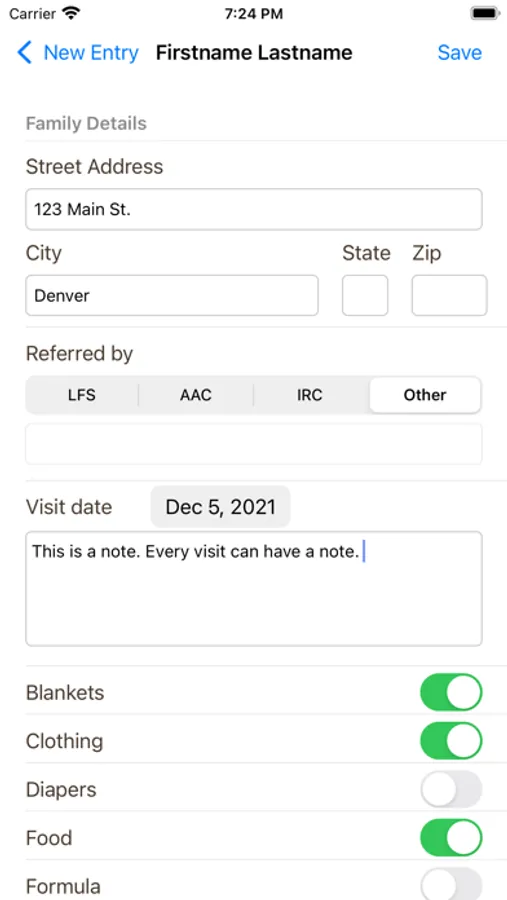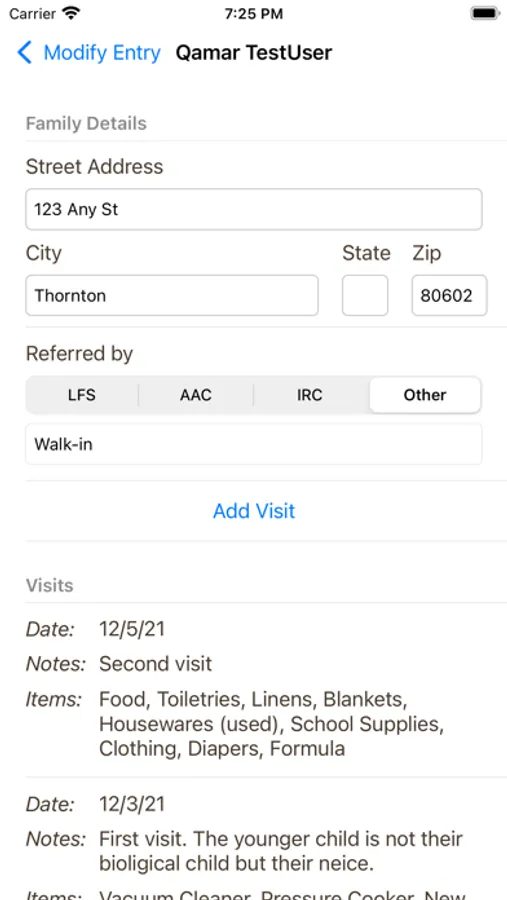 You can also add information about each visit. This allows you to see what you have historically donated to the family, and what they might need.