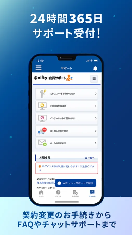 ・本アプリは@niftyのプロバイダーサービスをご利用中の個人会員様向けのアプリです。法人会員様または、@niftyのプロバイダーサービスをご利用でない個人会員様はログインいただけないのでご注意ください。