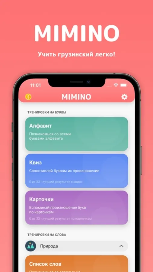 - Позволяет закреплять знания сразу в двух тренировках: квиз и карточки