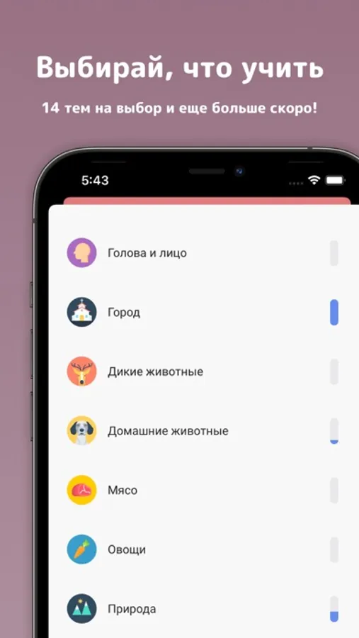 - Предлагает к обучению наборы слов популярных тематик