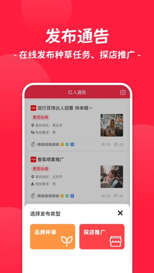 【发布通告】商家可以在线发布种草推广与探店推广任务通告。