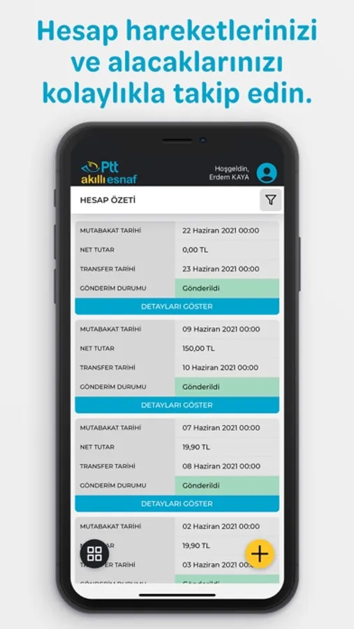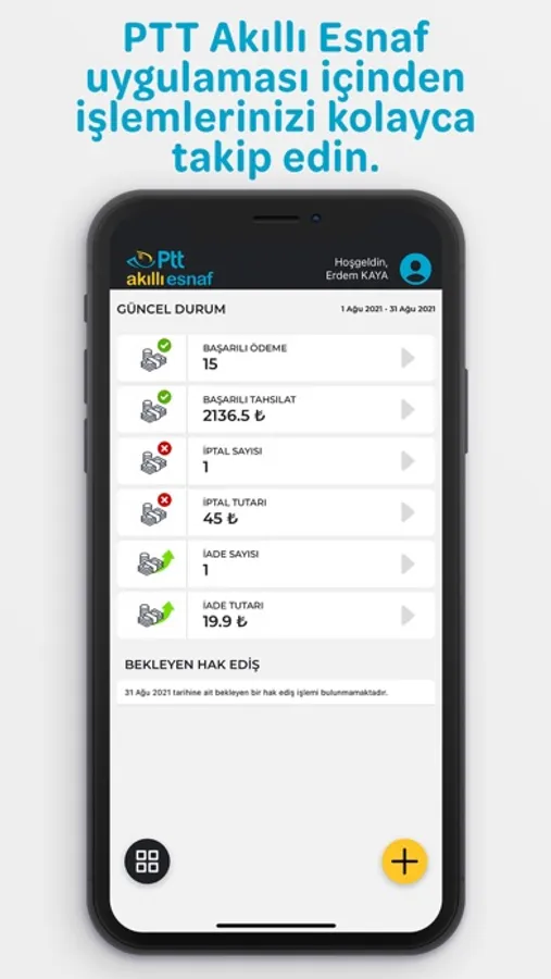 PTT Akıllı Esnaf uygulaması ile ödeme almanın yanı sıra uygulama içinden işlemlerinizi kolaylıkla takip edebilir, iptal/iade işlemlerinizi gerçekleştirebilir, hesabınıza geçen işlem bakiyelerini ve detaylarını görüntüleyebilirsiniz.