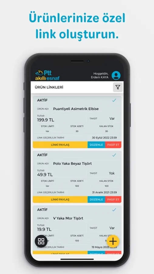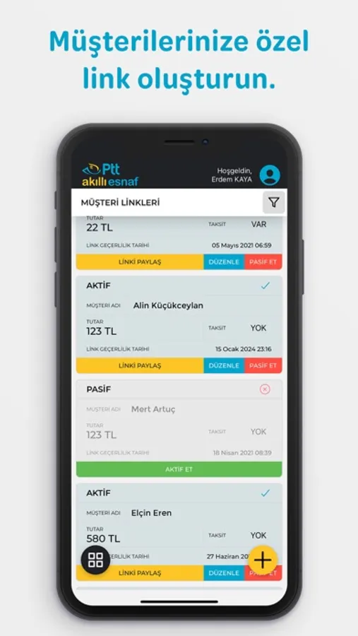 PTT Akıllı Esnaf uygulaması ile müşterilerinize özel ödeme linki oluşturabilir, EFT, havale veya kapıda ödeme gibi geleneksel yöntemlere gerek kalmadan oluşturduğunuz linki müşterinizle paylaşarak, ödemelerinizi tek tıkla ve hiçbir entegrasyona ihtiyaç duymadan almaya başlabilirsiniz.