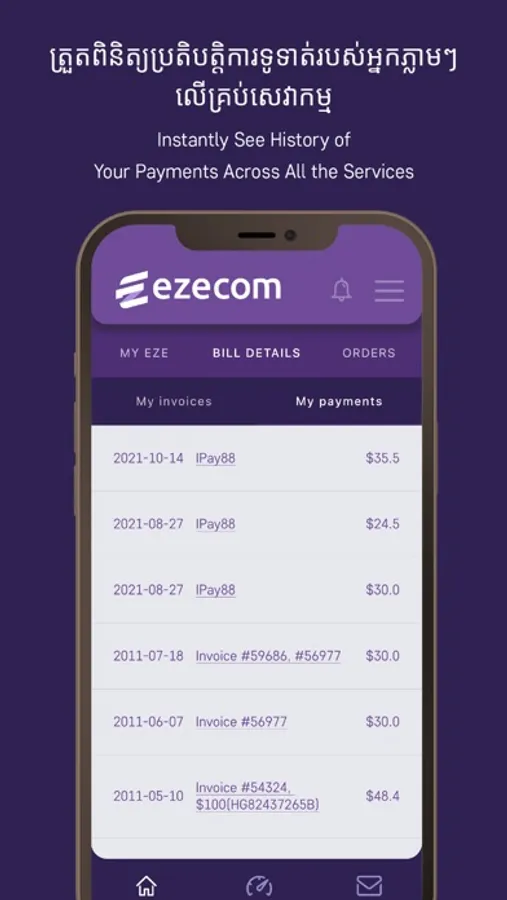 Payment: View all your payment history with Ezecom and also make instant payment through various payment partners