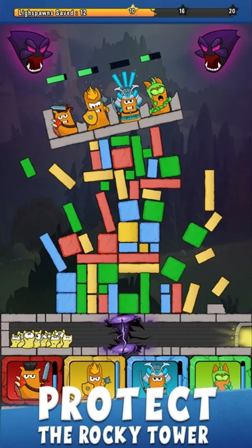 Use your wits to match color bricks in a ‘tumbling tower’ gameplay style. Match bricks of the same color to charge your heroes’ powers! In this tower defense game, you need to outwit the enemy monsters and make strategic choices to keep the puzzle tower standing. It’s all about puzzles and survival, last as long as you can and save the Lightspawn from the Void monsters!