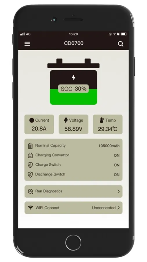The smart battery pack has a built-in remote bluetooth module, which connects to the mobile phone via bluetooth to the app, and the app can read the following information:
