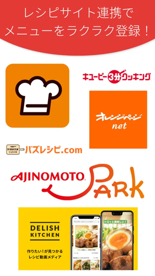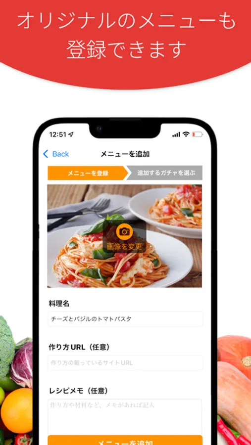 本アプリでは、最初から沢山のメニューが登録されていますが、我が家オリジナルのメニューや自分好みの料理などを登録することもできます。