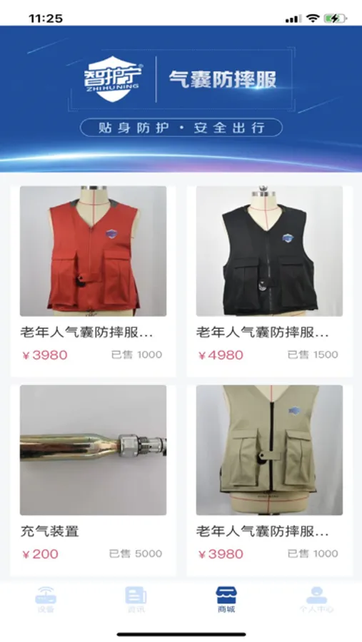 智护宁智能型气囊防摔服通过内置的传感器实时检测人体动作,在判定人体跌倒或跌落(达到产品的触发保护条件)时,立即触发气囊充气展开,降低身体与地面的撞击力,避免或减轻伤害,从而实现对穿戴者的保护,本产品适合老年人穿戴及摩托车、电动车、马匹等骑行者穿戴。