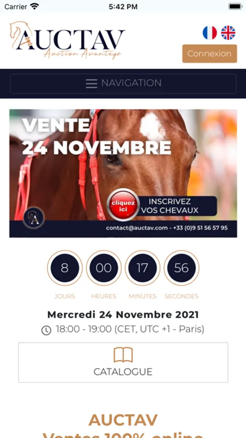 Vous voulez vendre un cheval ? Auctav le commercialise rapidement. Vous voulez acheter ? Complétez un profil sur Auctav et la salle des ventes virtuelle vous est ouverte, où que vous vous trouviez dans le monde.
