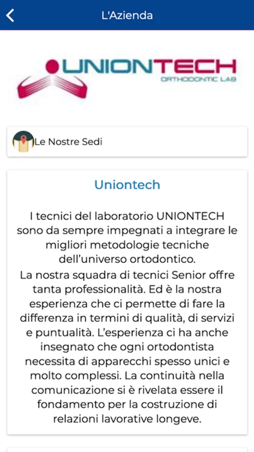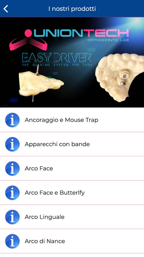 L'app consente di poter visualizzare il catalogo prodotti diviso per categorie, e in costante evoluzione, del laboratorio Uniontech.