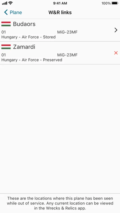 Click on a plane in any of the lists and view more detailed data, including sightings for this plane, any Wrecks & Relics info known, or the other identities the same plane is known to have had. The app also links into the other Spottingmode apps so you can also immediately find more info on the Wrecks & Relics location, or where you saw the particular plane.