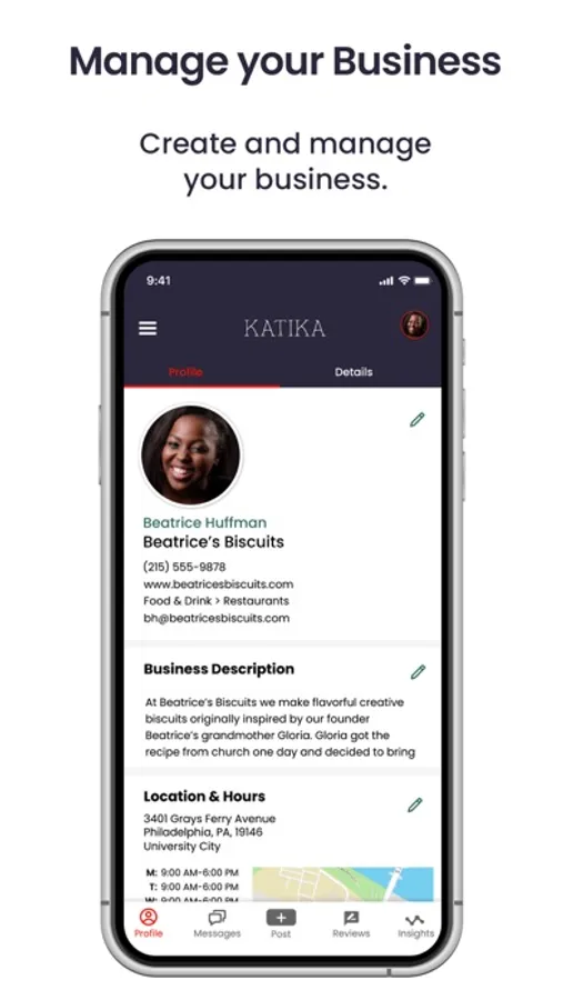 Katika is a social networking platform made to discover black businesses. The Katika for Business app allows black business owners to create, manage and market their businesses on the Katika platform.